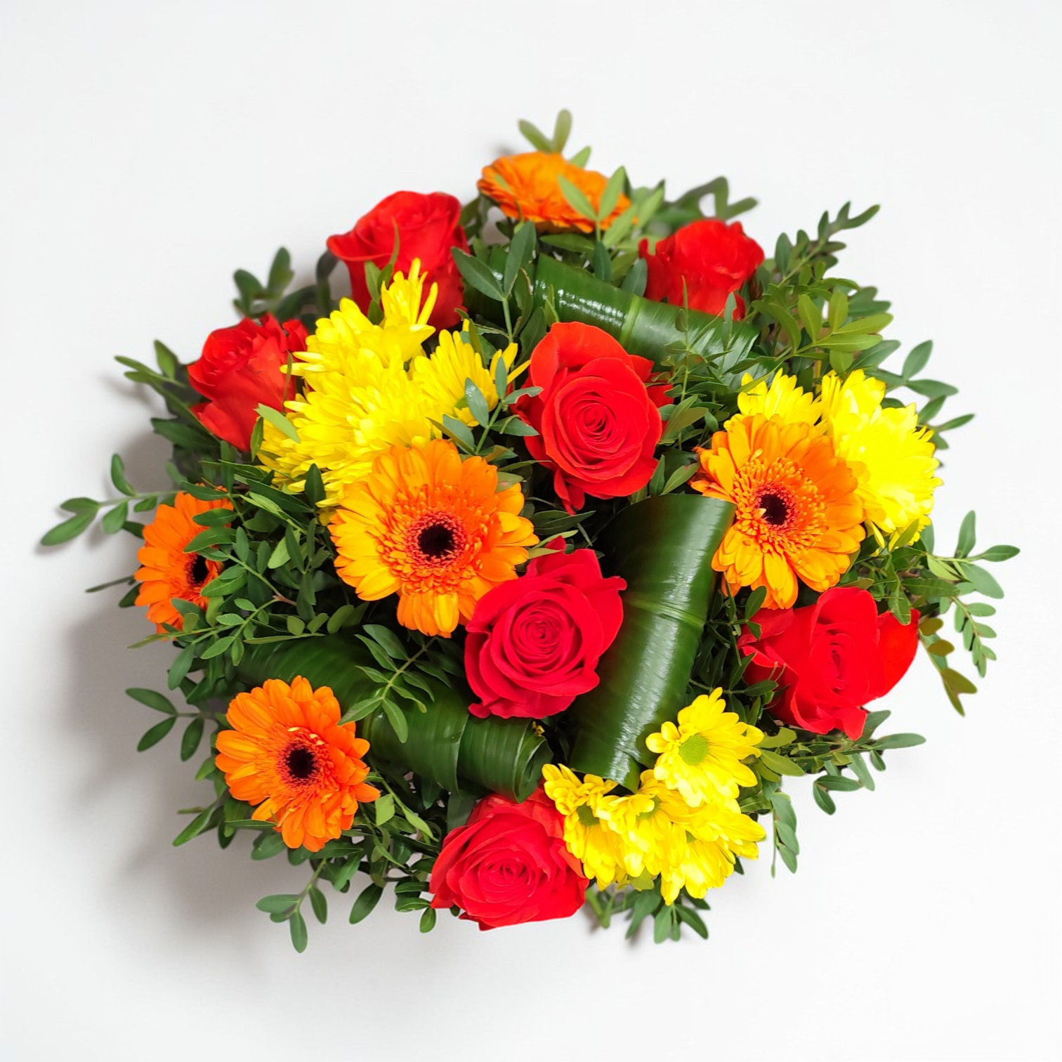 Un bouquet chaleureux et lumineux, parfait pour exprimer des émotions sincères, célébrer des moments joyeux ou illuminer un espace avec ses teintes chaudes et réconfortantes.
