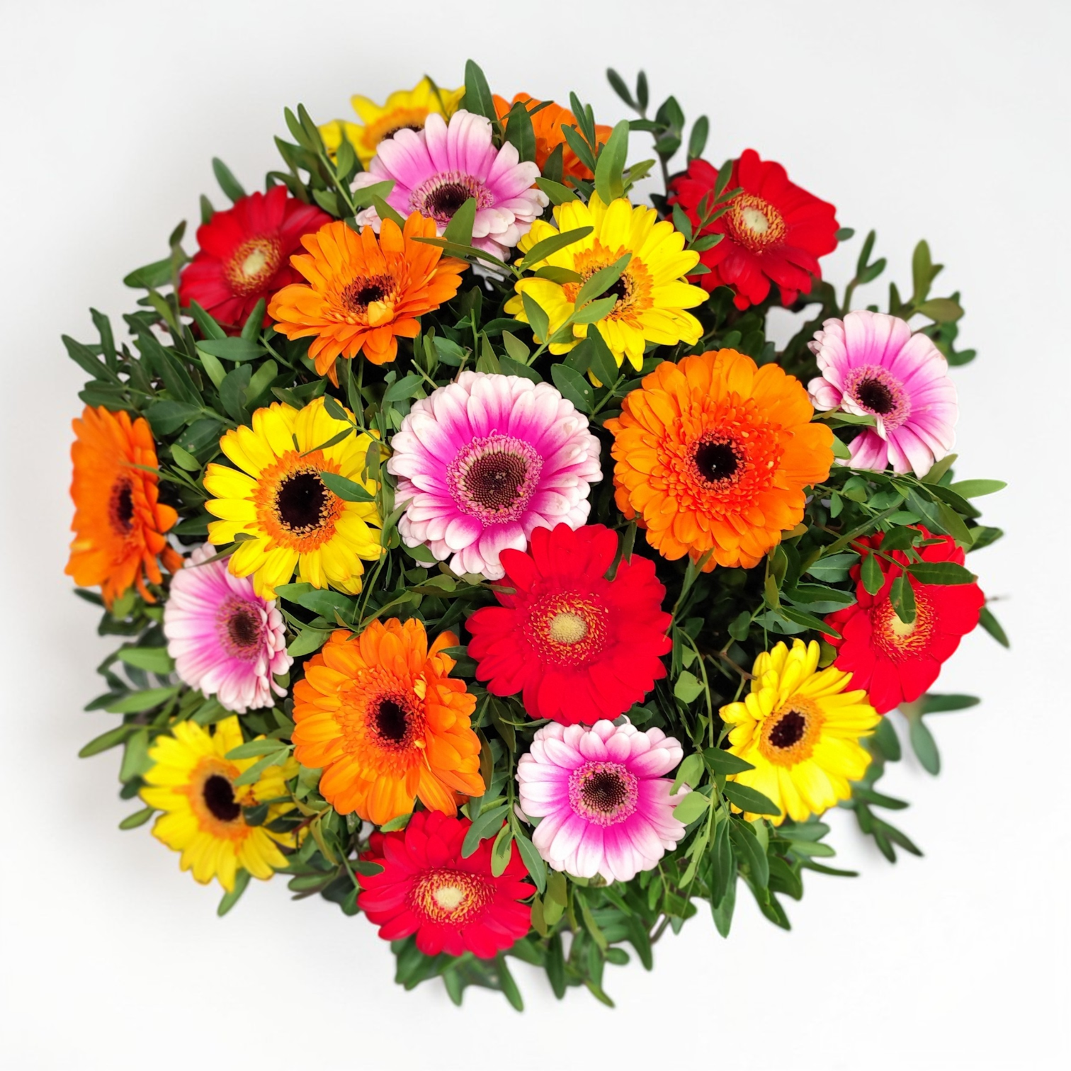 Un bouquet lumineux et coloré, idéal pour exprimer des émotions positives, célébrer des moments joyeux ou illuminer un espace avec élégance et fraîcheur.